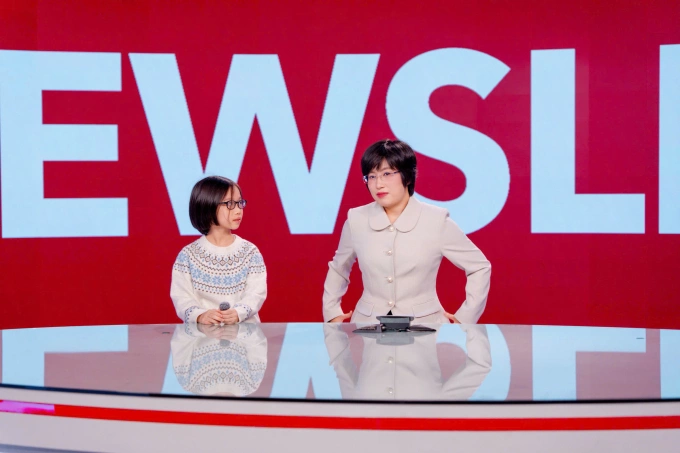 Lê Trần Vân Anh (trái), 9 tuổi, ở phường Nha Trang tham gia trải nghiệm dẫn bản tin tiếng Anh của Đài truyền hình Việt Nam. Ảnh: Nhân vật cung cấp