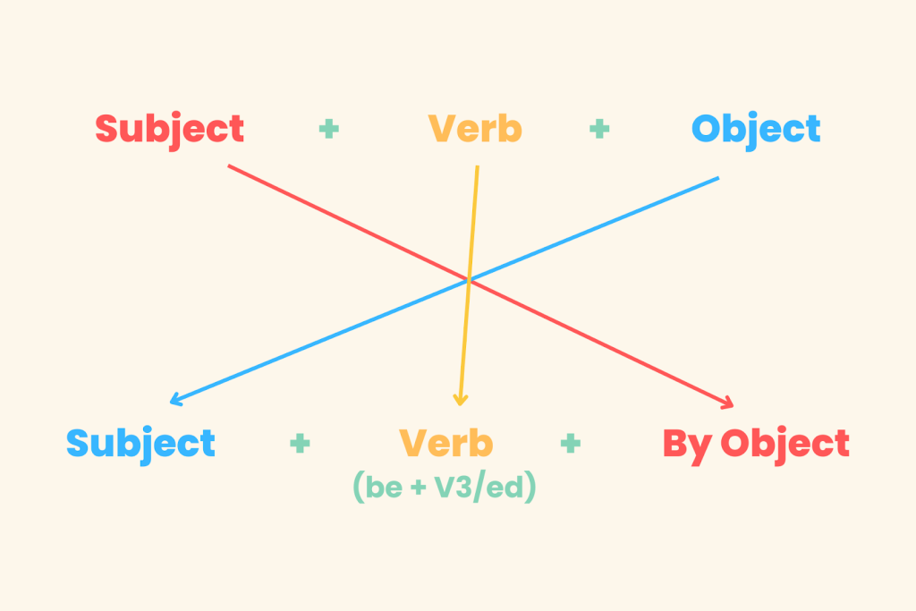 Chủ ngữ ban đầu có thể được chuyển thành tân ngữ và đặt sau by. Trong nhiều trường hợp, phần by + O có thể lược bỏ nếu không cần nhấn mạnh tác nhân gây ra hành động.