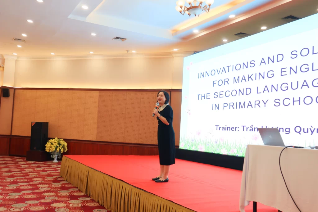 Sau phần phát biểu khai mạc và định hướng của lãnh đạo Sở, hội nghị vinh dự có sự tham gia của Tiến sĩ Trần Hương Quỳnh – Trưởng Khoa Tiếng Anh, Trường Đại học Sư phạm Hà Nội, báo cáo viên chính của chương trình. Với nhiều năm kinh nghiệm trong đào tạo giáo viên và nghiên cứu phương pháp giảng dạy tiếng Anh, Tiến sĩ đã mang đến cho các đại biểu những chuyên đề chuyên sâu về đổi mới phương pháp giảng dạy tiếng Anh theo hướng thực tiễn, hiện đại, hướng đến mục tiêu tiếng Anh thực sự trở thành ngôn ngữ thứ hai trong nhà trường.